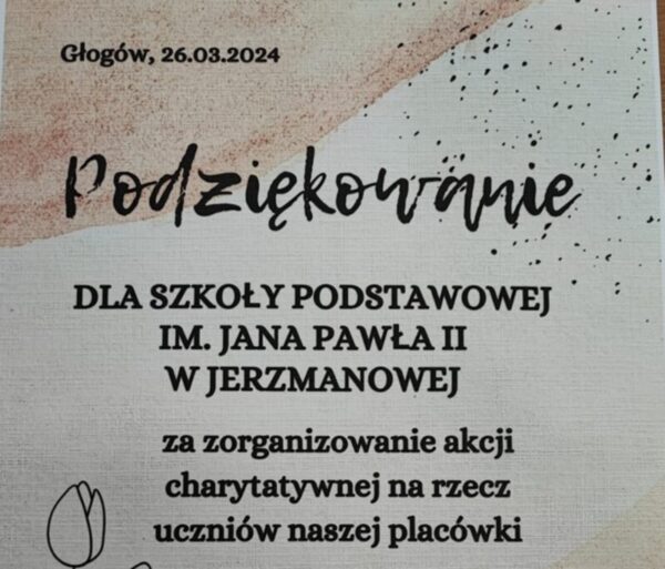 W ostatnim czasie uczniowie naszej szkoły uczestniczyli w akcji świątecznej pod hasłem “Uśmiechnij się Zajączku”, której celem była zbiórka materiałów edukacyjnych na rzecz uczniów z Zespołu Placówek Szkolno – Wychowawczych w Głogowie. Organizatorem akcji była szkolna psycholog Karolina Pisarska. Wszystkim dobroczyńcom składamy serdeczne podziękowania za włączenie się w szkolną akcję. W podziękowaniu za otrzymane dary...Czytaj więcej