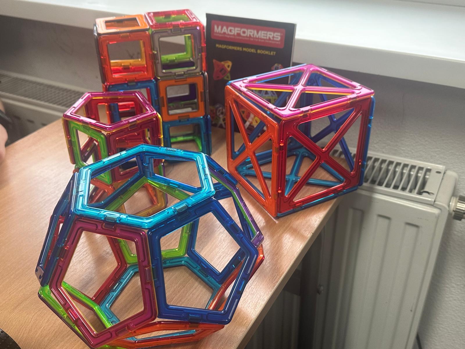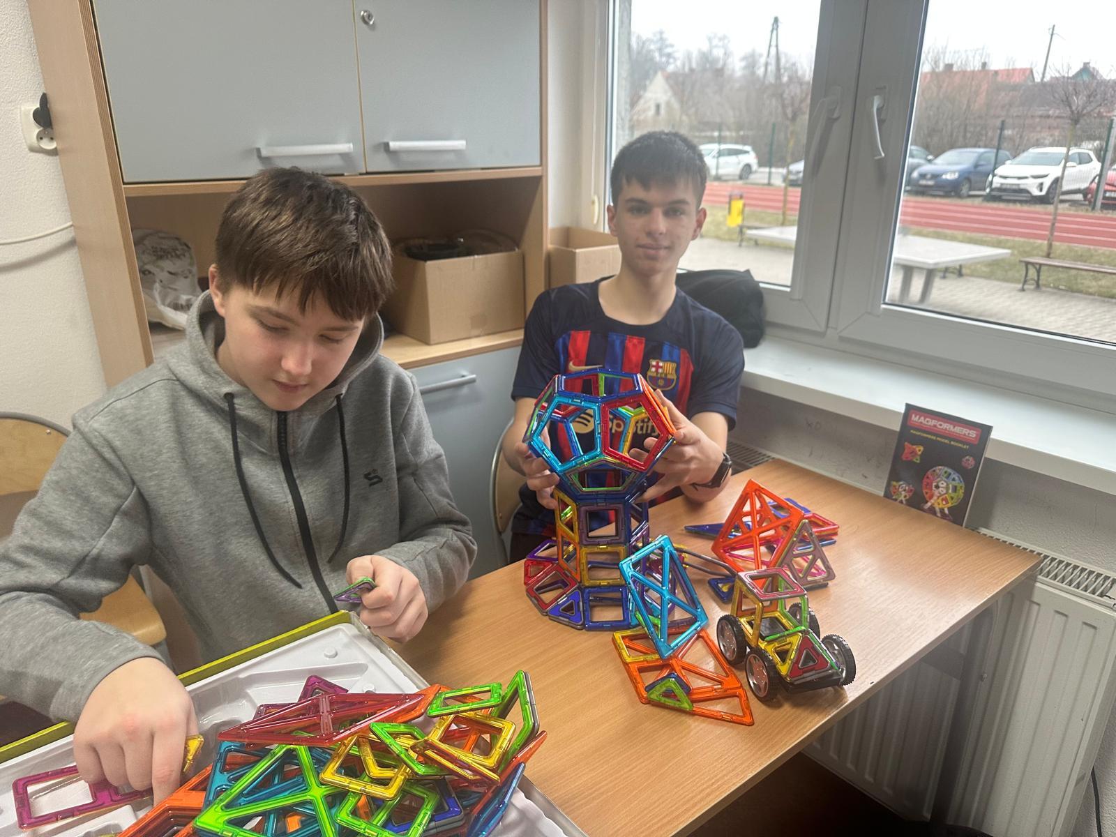 Na lekcjach matematyki w klasach 8 teoria spotkała się z praktyką! Uczniowie, przygotowując się do egzaminu, wzięli udział w warsztatach konstrukcyjnych poświęconych geometrii przestrzennej, wykorzystując nowoczesne magnetyczne klocki Magformers z programu Laboratoria Przyszłości.
