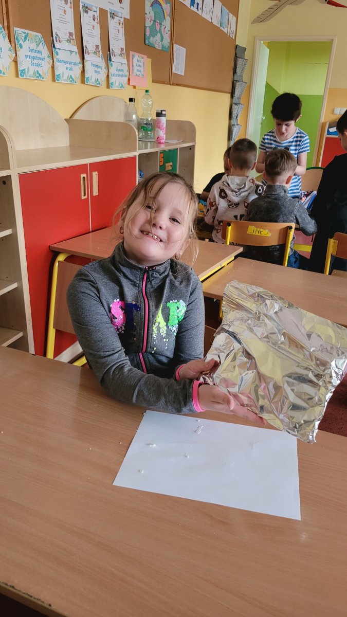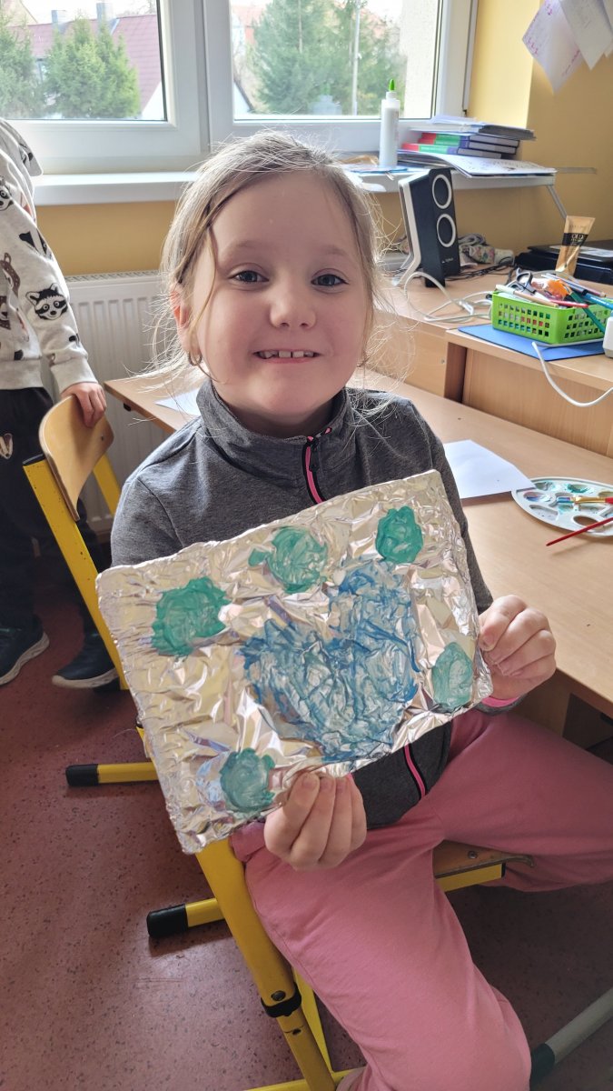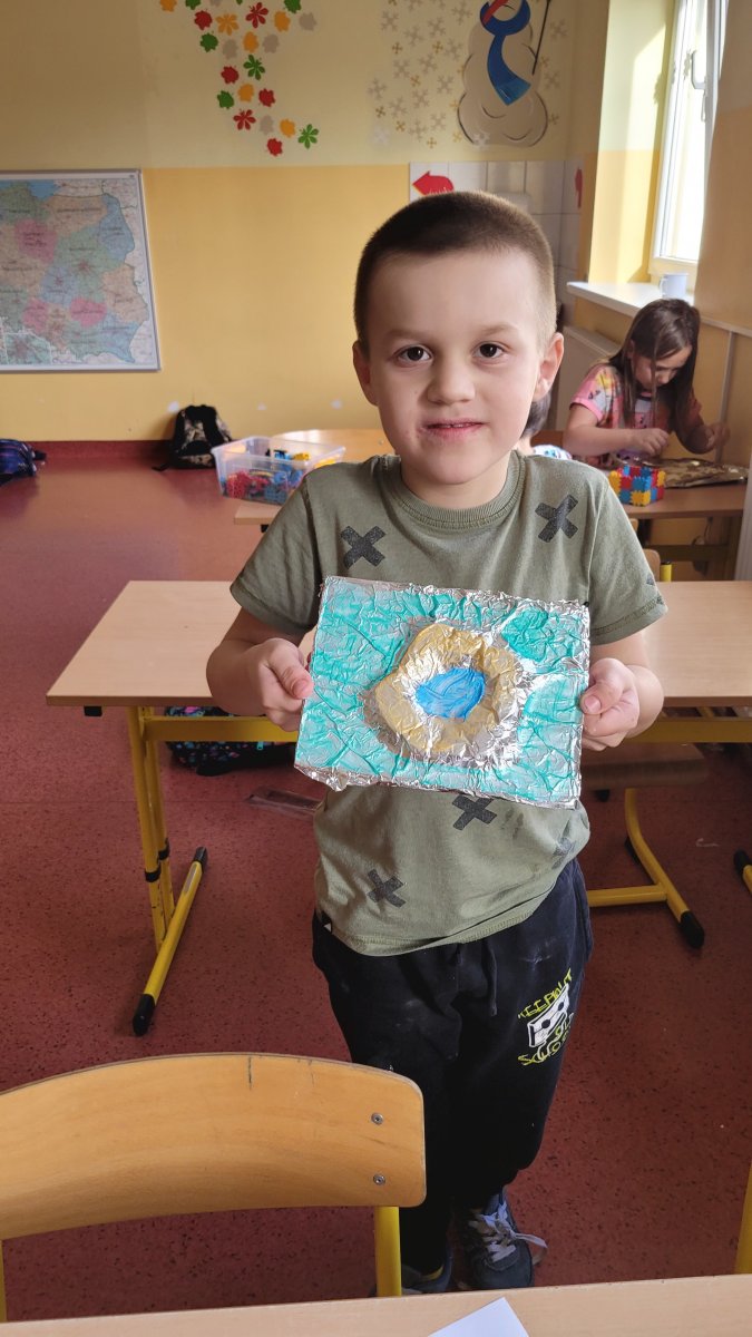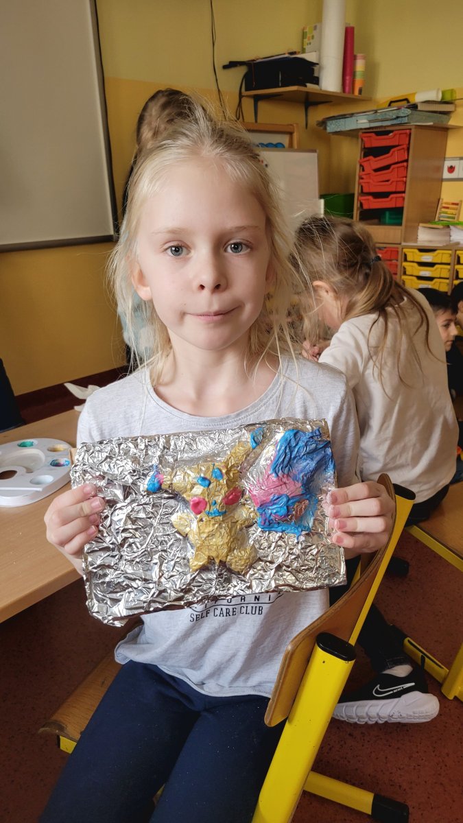 Z okazji Dnia Babci i Dziadka dzieci z naszej świetlicy przygotowały wyjątkowe prace plastyczne. Wykonały srebrne obrazy przestrzenne, wykorzystując między innymi folię aluminiową i masę solną. Każde dziecko stworzyło swoją własną, unikalną kompozycję.