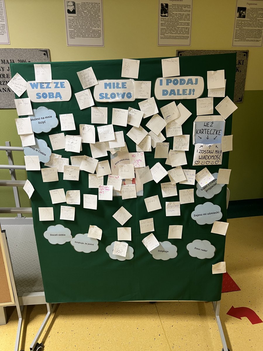 W dniach 27-31 stycznia w naszej szkole odbył się Dzień Miłego Słowa. W ramach tej inicjatywy uczniowie z całej szkoły mieli okazję napisać miłe słowo do innej osoby i zostawić je na specjalnie przygotowanej tablicy.