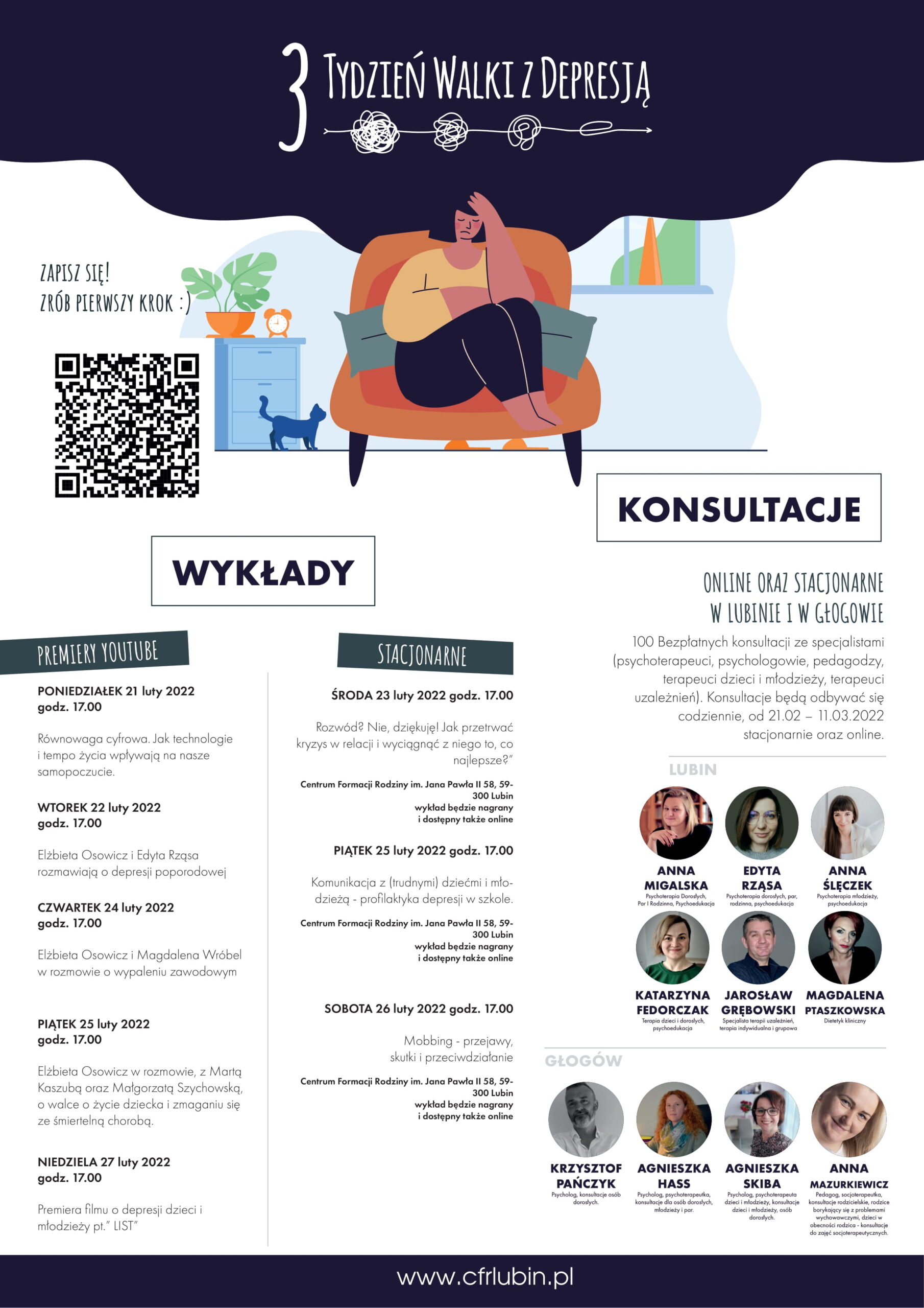 23 lutego przypada Ogólnopolski Dzień Walki z Depresją. CENTRUM FORMACJI RODZINY IM. Jana Pawła II w Lubinie oraz GŁOGOWSKIE STOWARZYSZENIE OTWARTE DRZWI wraz z partnerem KGHM POLSKA MIEDŹ S.A zapraszają do obchodów tego dnia poprzez udział w III TYGODNIU WALKI Z DEPRESJĄ, w dniach 21- 27 lutego 2022
