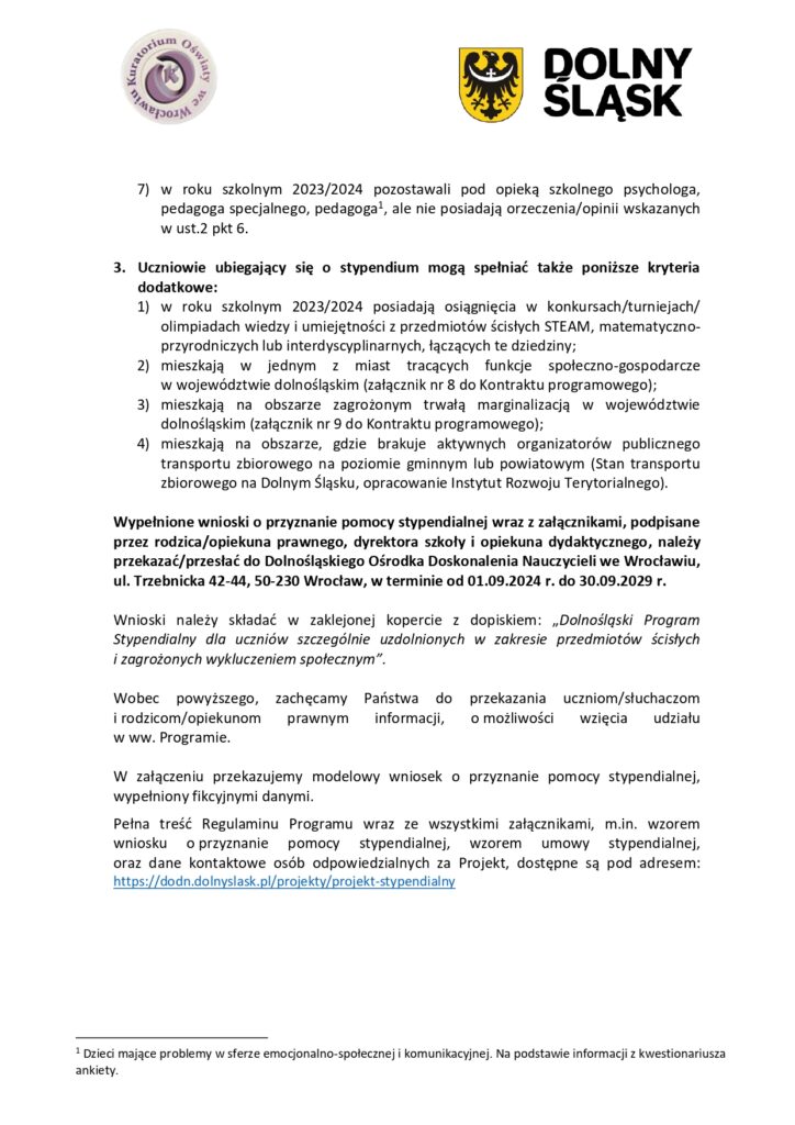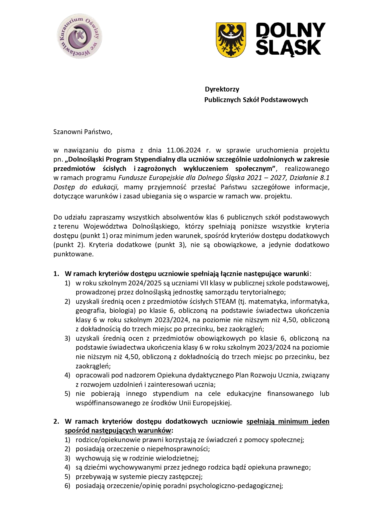Informujemy o Dolnośląski Programie Stypendialnym do absolwentów klas 6 szkół podstawowych z terenu województwa dolnośląskiego. Szczegółowe informacje znajdziecie Państwo w piśmie oraz na stronie internetowej, które zamieszczamy poniżej.
