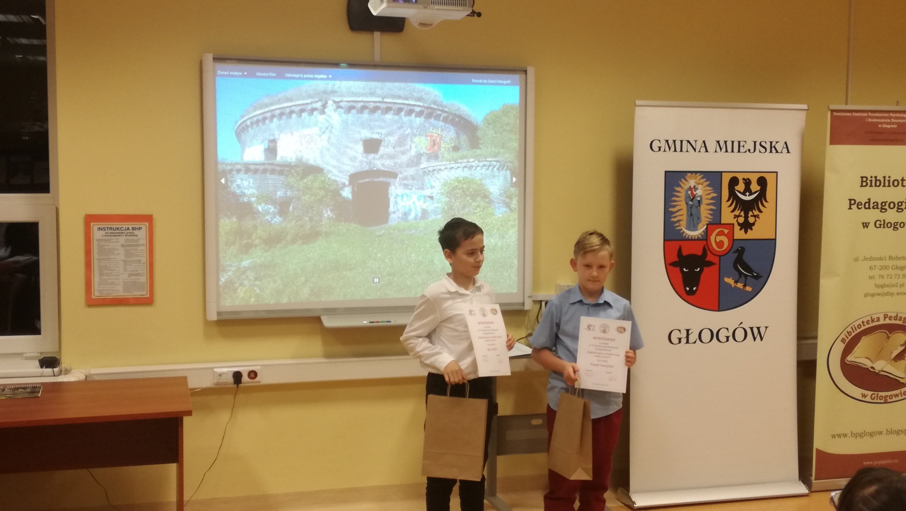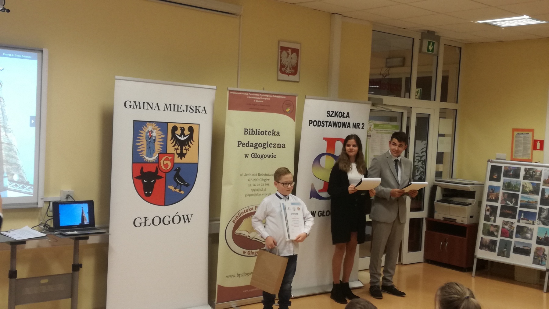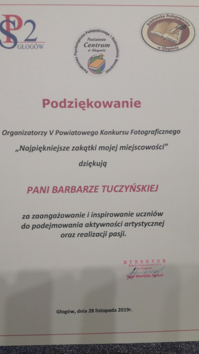 Uczniowie Szkoły podstawowej im. Jana Pawła II w Jerzmanowej bardzo chętnie biorą udział w różnych konkursach. Rozwijają swoje pasje i zainteresowania, a przy okazji zdobywają nagrody. Z dumą informujemy iż laureaci z naszej szkoły V Powiatowego Konkursu Fotograficznego „Najpiękniejsze zakątki mojej miejscowości ” to: Dominik Piątek – III miejsce w kategorii klas I-III, Mateusz Knihnicki – II miejsce w kategorii klas IV-VIII, Paweł Tuczyński – wyróżnienie w tej samej kategorii. Uroczyste wręczenie nagród nastąpiło 28 listopada w Bibliotece Pedagogicznej w Głogowie. Uczniowie, wraz z opiekunem szkolnym – panią Barbara Tuczyńską otrzymali pamiątkowe kalendarze, w których wyeksponowano nagrodzone zdjęcia. Gratulujemy wszystkim uczestnikom konkursu i zachęcamy do dalszej aktywności.