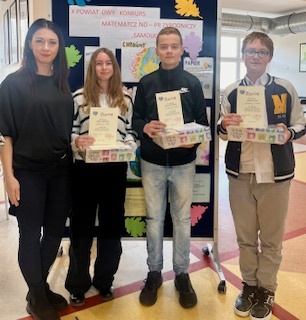 Reprezentacja naszej szkoły w składzie Paulina Serwaczak i Dominik Piątek z klasy 7b oraz Mateusz Kuczyński z klasy 8 pracując zespołowo świetnie poradzili sobie z dominem matematycznym, krzyżówką przyrodniczą i tekstem matematyczno – przyrodniczym. Następnie indywidualnie wykazali się swoją wiedzą i umiejętnościami, odpowiadając na dwanaście pytań w teście matematyczno – przyrodniczym.