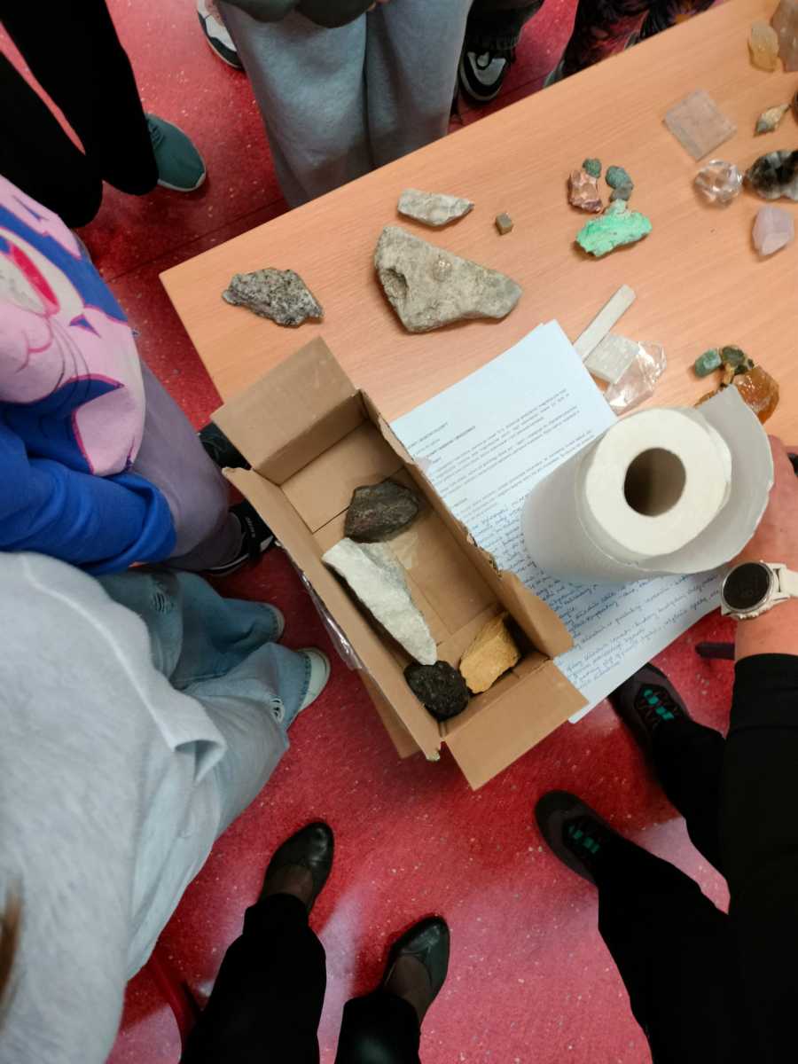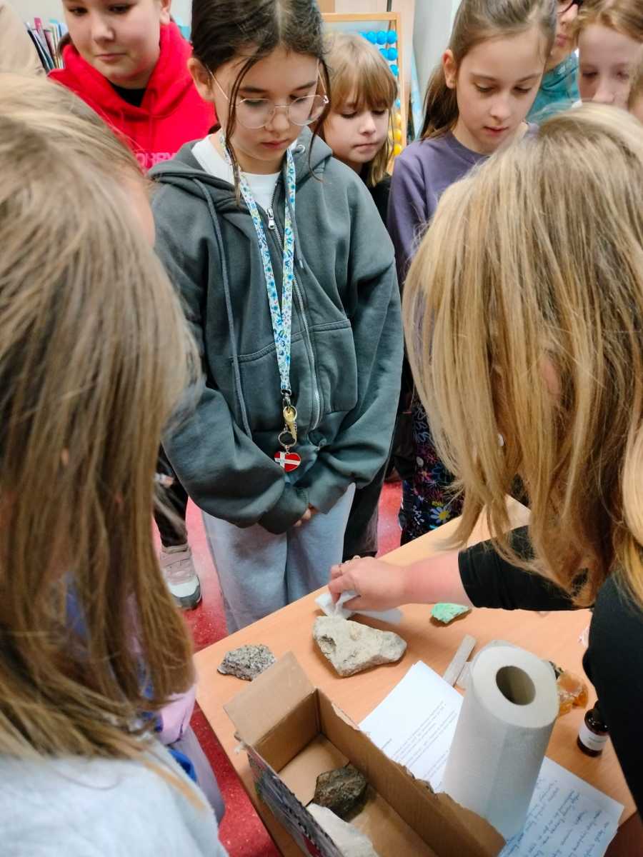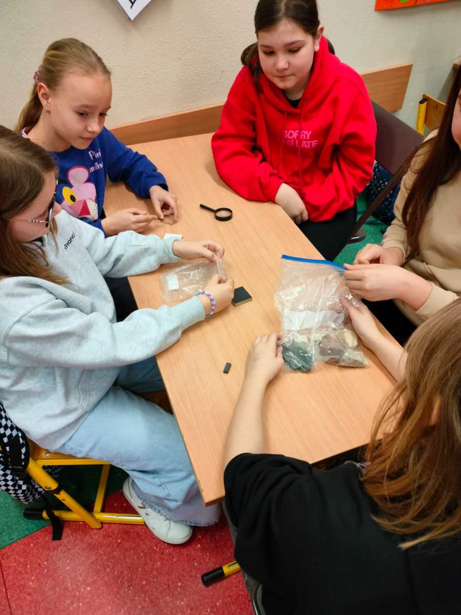 - naukę rozpoznawania różnych rodzajów skał i minerałów poprzez aktywny udział uczniów w badaniu skał (praca z lupą, magnesem, oznaczanie twardości minerałów wg skali Mohsa, sprawdzanie charakterystycznych cech fizycznych – rysy, reakcja z kwasem solnym),