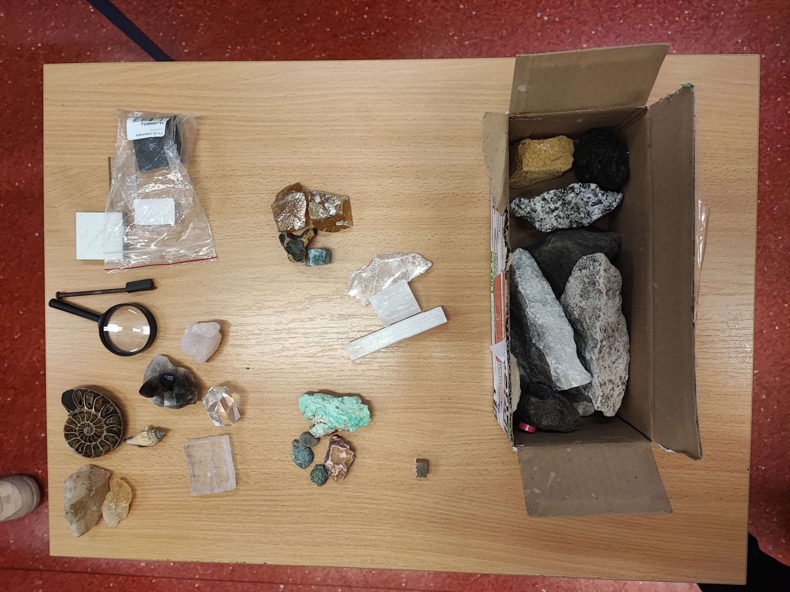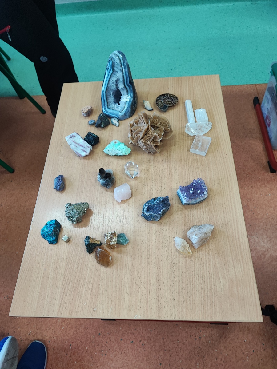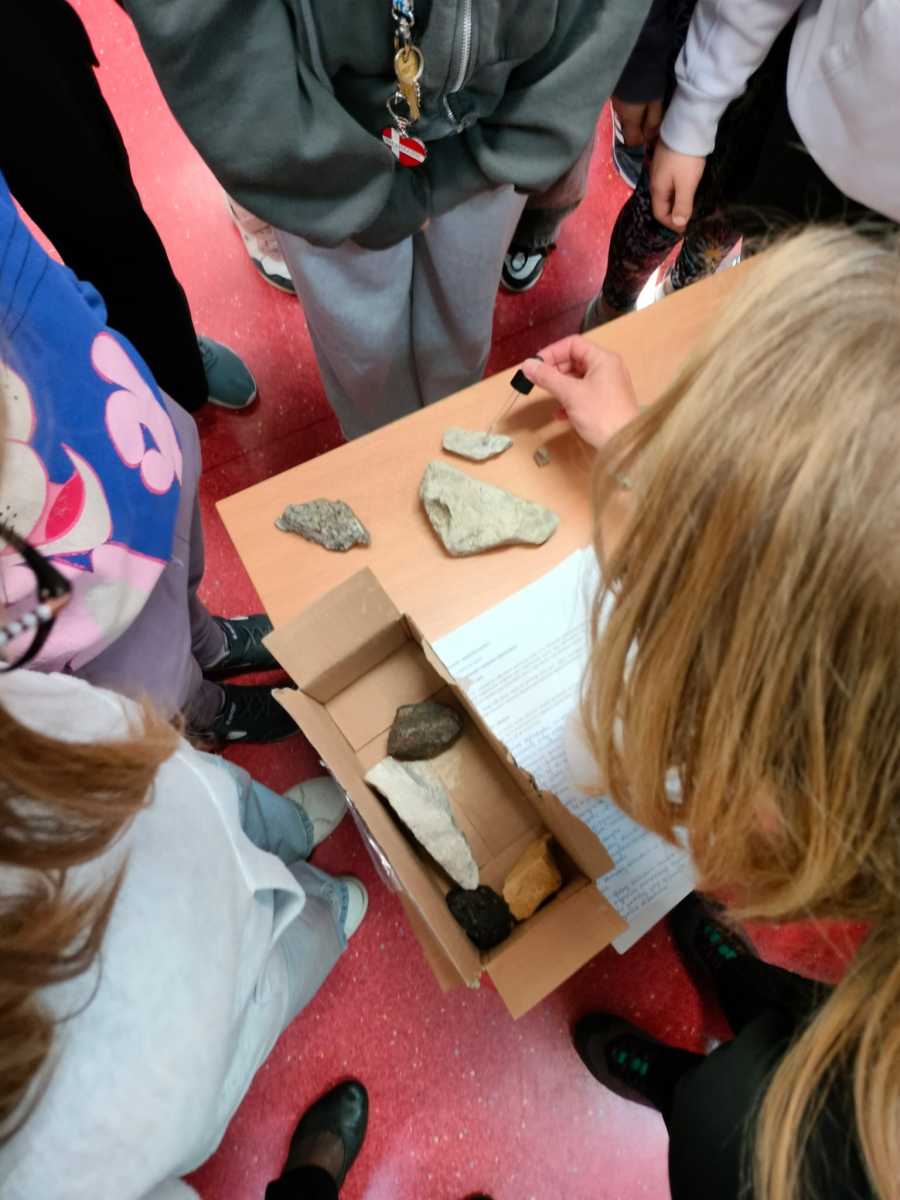 - naukę rozpoznawania różnych rodzajów skał i minerałów poprzez aktywny udział uczniów w badaniu skał (praca z lupą, magnesem, oznaczanie twardości minerałów wg skali Mohsa, sprawdzanie charakterystycznych cech fizycznych – rysy, reakcja z kwasem solnym),