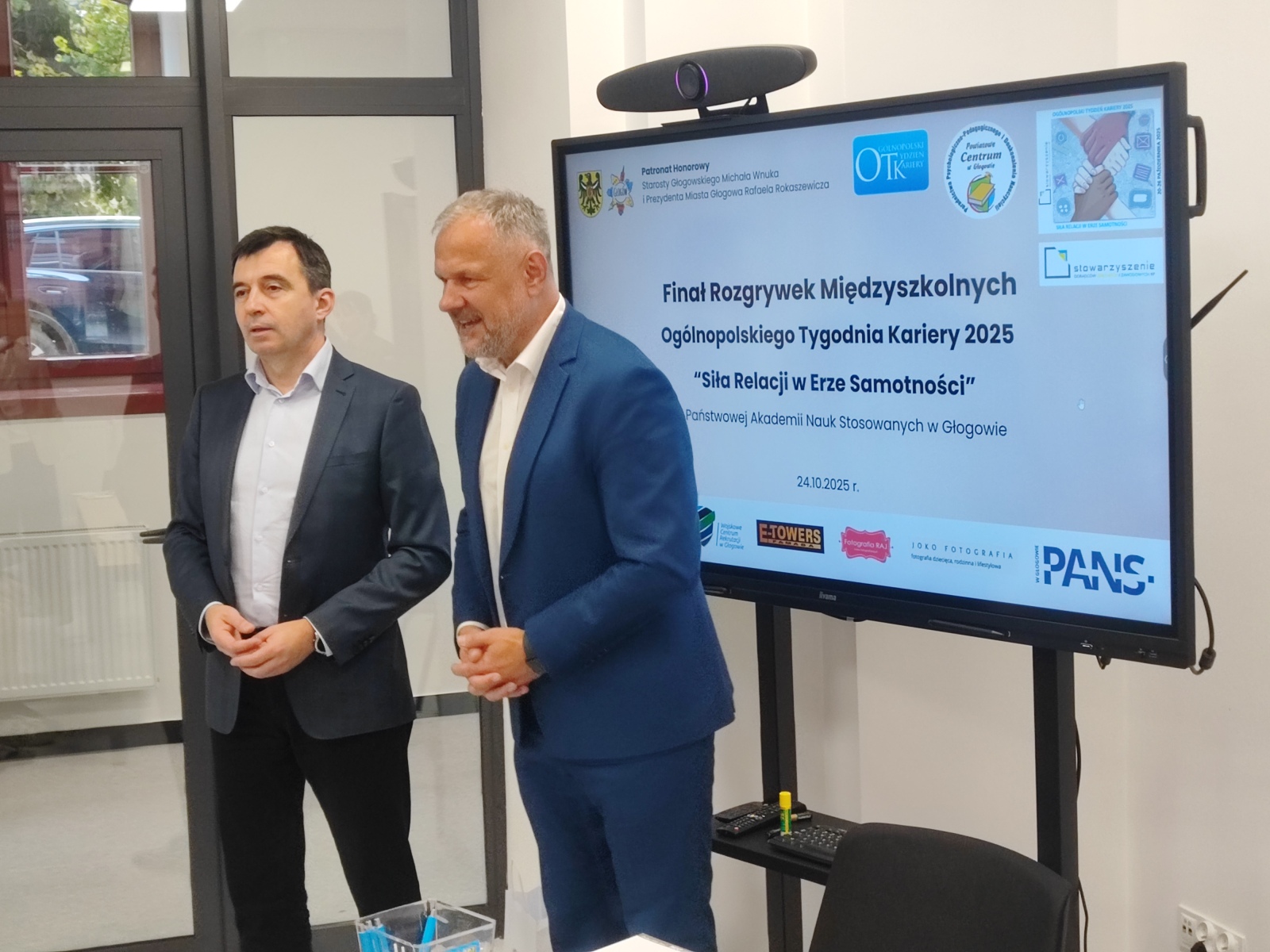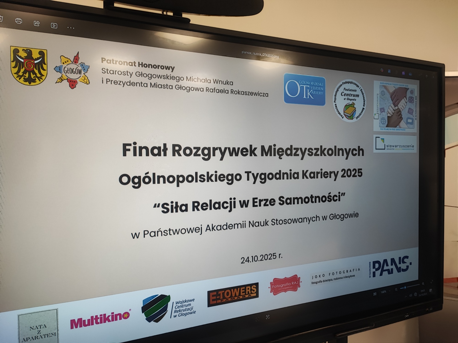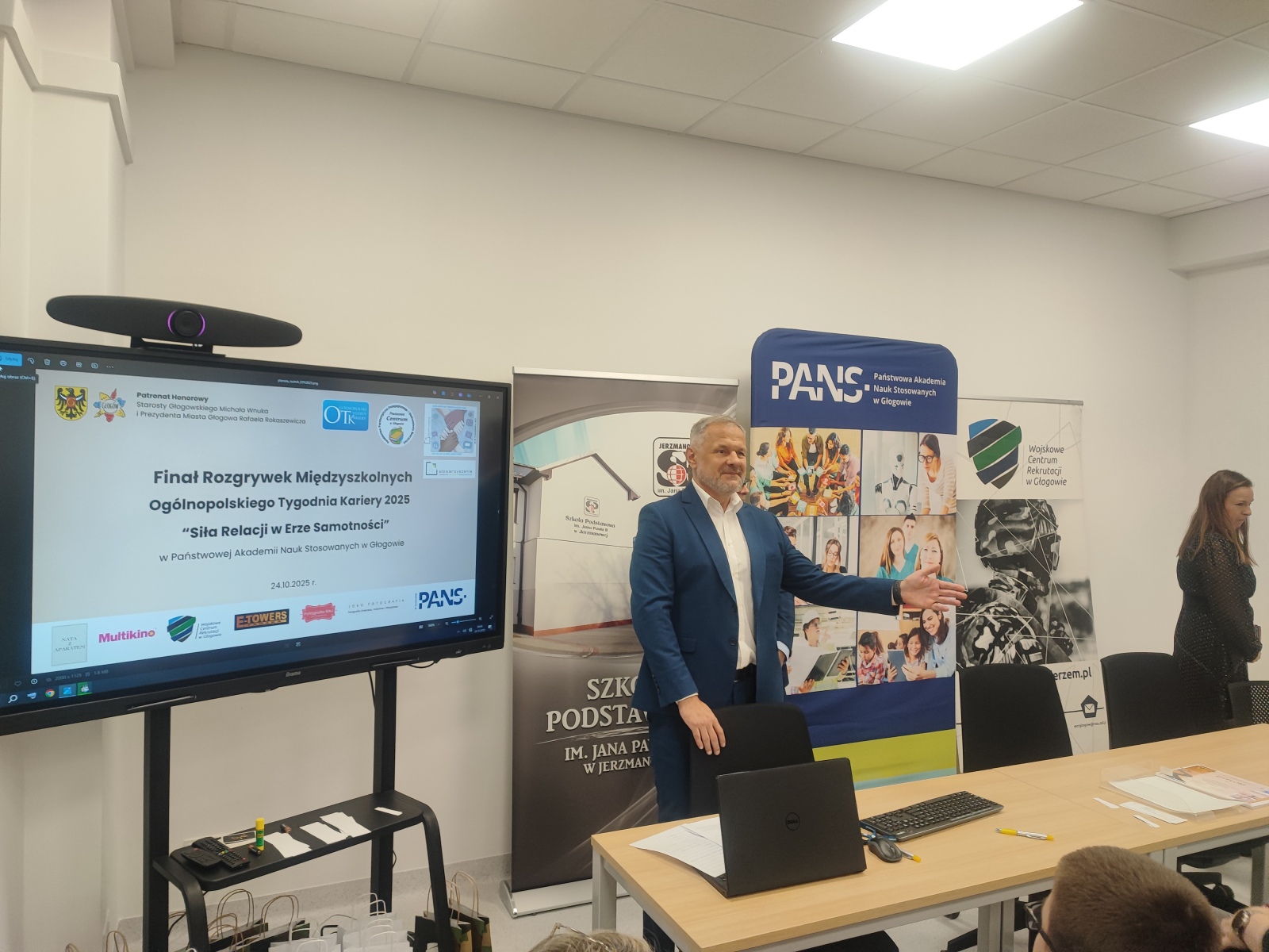 24 października odbył się finał gry terenowej przeprowadzanej w powiecie głogowskim w ramach działań związanych z Ogólnopolskim Tygodniem Kariery. W tym roku sieć nauczycieli doradców zawodowych zaproponowała uczniom klas ósmych oraz pierwszych szkół ponadpodstawowych udział w grze terenowej pod tegorocznym hasłem OTK “Siła relacji w erze samotności”. Do zabawy przystąpiło osiemnaście szkół z powiatu głogowskiego. Bardzo cieszy nas niezwykła frekwencja wydarzenia. Szkoła Podstawowa im Jana Pawła II w Jerzmanowej była współorganizatorem projektu, a pani Barbara Tuczyńska autorką gry. Finał, w którym wzięli udział zwycięzcy z poszczególnych szkół, miał miejsce w siedzibie PANS w Głogowie. Z niezwykle kreatywnymi zadaniami zmierzyło się 36 uczniów wraz z opiekunami. Wyznawania sprawdzamy umiejętności komunikacyjne, współpracę w grupie czy innowacyjne podejście do problemu. Wszyscy doskonale się bawili, co było najlepszą recenzją dla tej formuły konkursu. Patronat nad wydarzeniem objął prezydent miasta Głogowa Rafael Rokaszewicz oraz starosta, Michał Wnuk. Sponsorami nagród byli między innymi: Multikino, E-Towers Famaba S.A., lokalne fotografki: Fotografia Raj, Natalia Verenych, Joko fotografia oraz Wojskowe Centrum Rekrutacji w Głogowie. Bardzo dziękujemy za wsparcie oraz zaangażowanie wszystkich członkiń sieci doradców zawodowych, której koordynatorem jest pani Agnieszka Szymańska. Dziękujemy szkołom za tak pozytywny odbiór inicjatywy oraz liczne uczestnictwo. Uczniom gratulujemy pomysłowości oraz nieszablonowego spojrzenia na otaczającą ich rzeczywistość. Szkołę Podstawową w Jerzmanowej reprezentowały Nela Worobiew oraz Zuzanna Boczula. Dziewczyny, dziękujemy za wasze zaangażowanie!