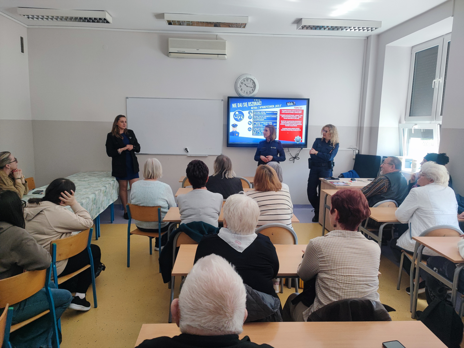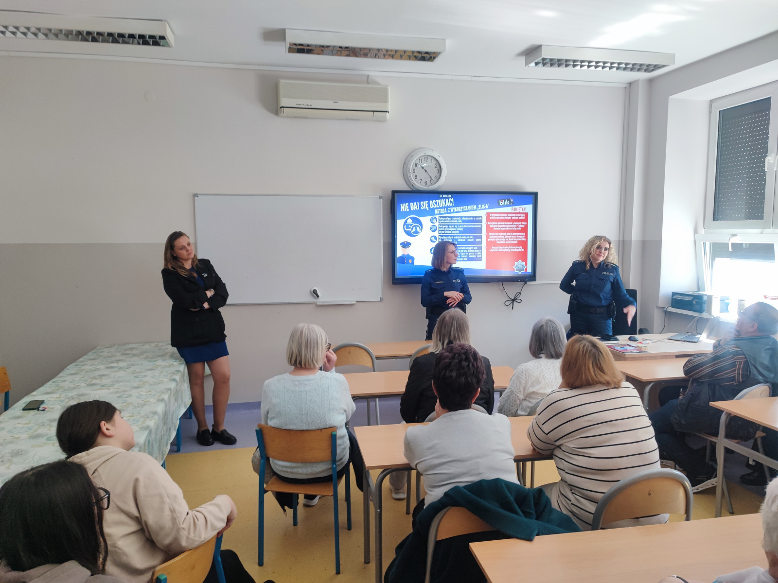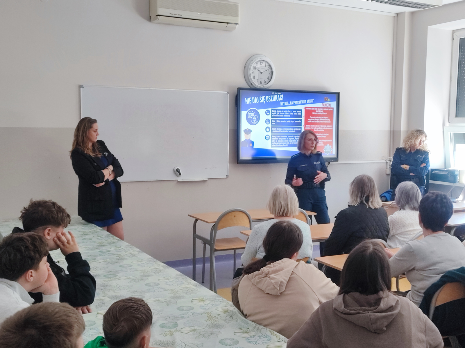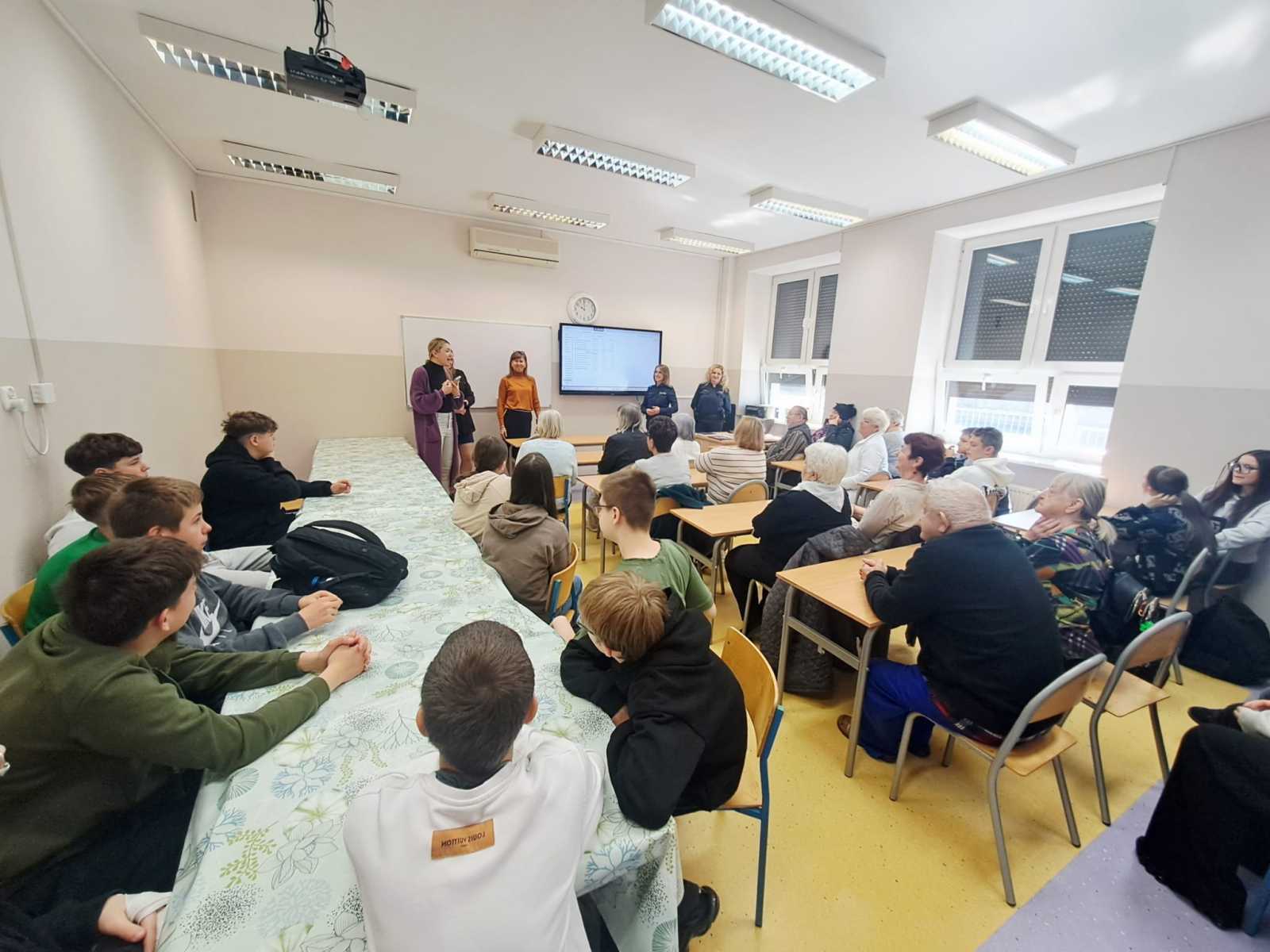27 kwietnia uczniowie klasy 7 uczestniczyli w niezwykłej lekcji. W ramach programu Międzypokoleniowa szkoła odbyło się spotkanie z policjantkami z Komendy Powiatowej Policji w Głogowie. W spotkaniu uczestniczyli także seniorzy z Klubu Seniora w Jerzmanowej. Zajęcia dotyczyły szeroko pojętego bezpieczeństwa. Policjantki omówiły najbardziej popularne zagrożenia czekający na użytkowników w sieci. Na szczęście nasi seniorzy wykazali się dużą znajomością tematu i wiedzieli jak prawidłowo zareagować w sytuacji, gdy ktoś chce i oszukać metodą “na wnuczka” albo “policjanta”. Dziękujemy KPP w Głogowie za wartościowe spotkanie. Mamy nadzieję, że dzięki zdobytym wiadomościom zarówno uczniowie jak i seniorzy będą jeszcze bardziej ostrożni i czujni.