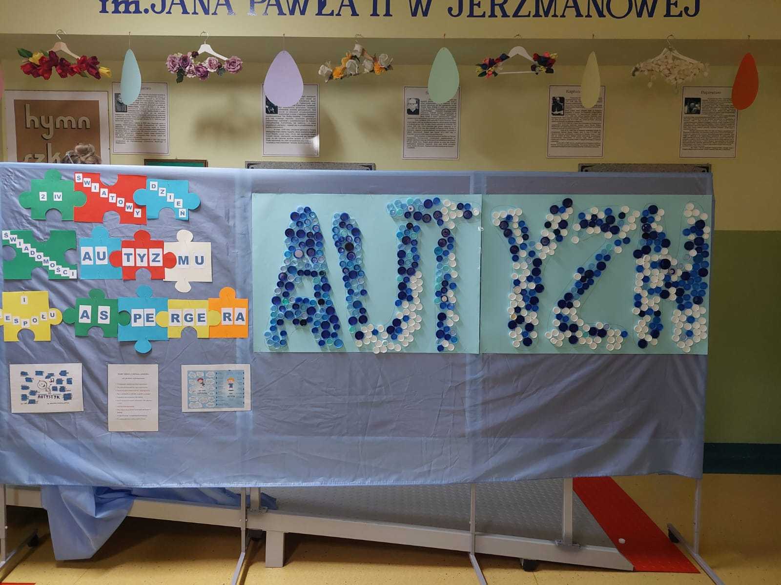 Dnia 28.03.2023 r. W Szkole Podstawowej im. Jana Pawła II w Jerzmanowej obchodziliśmy Światowy Dzień Świadomości Autyzmu. Tego dnia uczniowie przyszli ubrani na niebiesko, aby w ten sposób wyrazić solidarność z osobami cierpiącymi na autyzm. W naszej szkole pojawiły się plakaty i informacje na temat trudności z jakimi codziennie zmagają się osoby autystyczne. Dzieci wspólnie wykonały plakat wykorzystując niebieskie nakrętki.