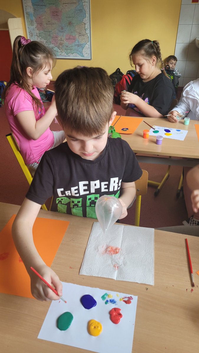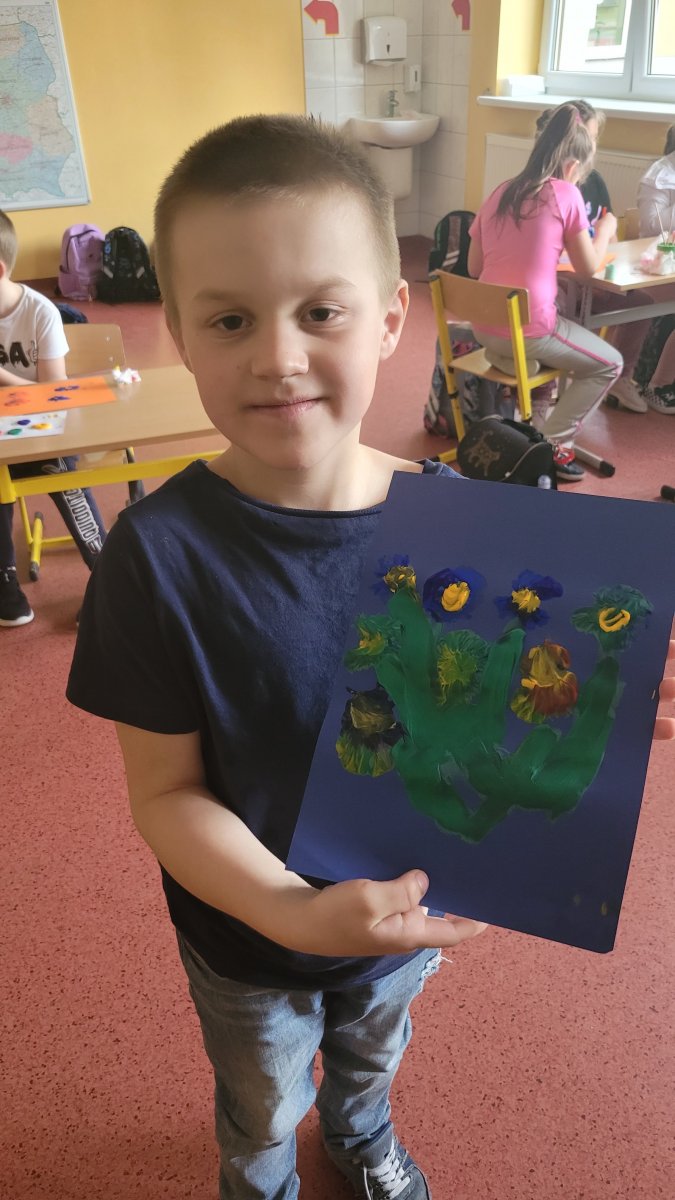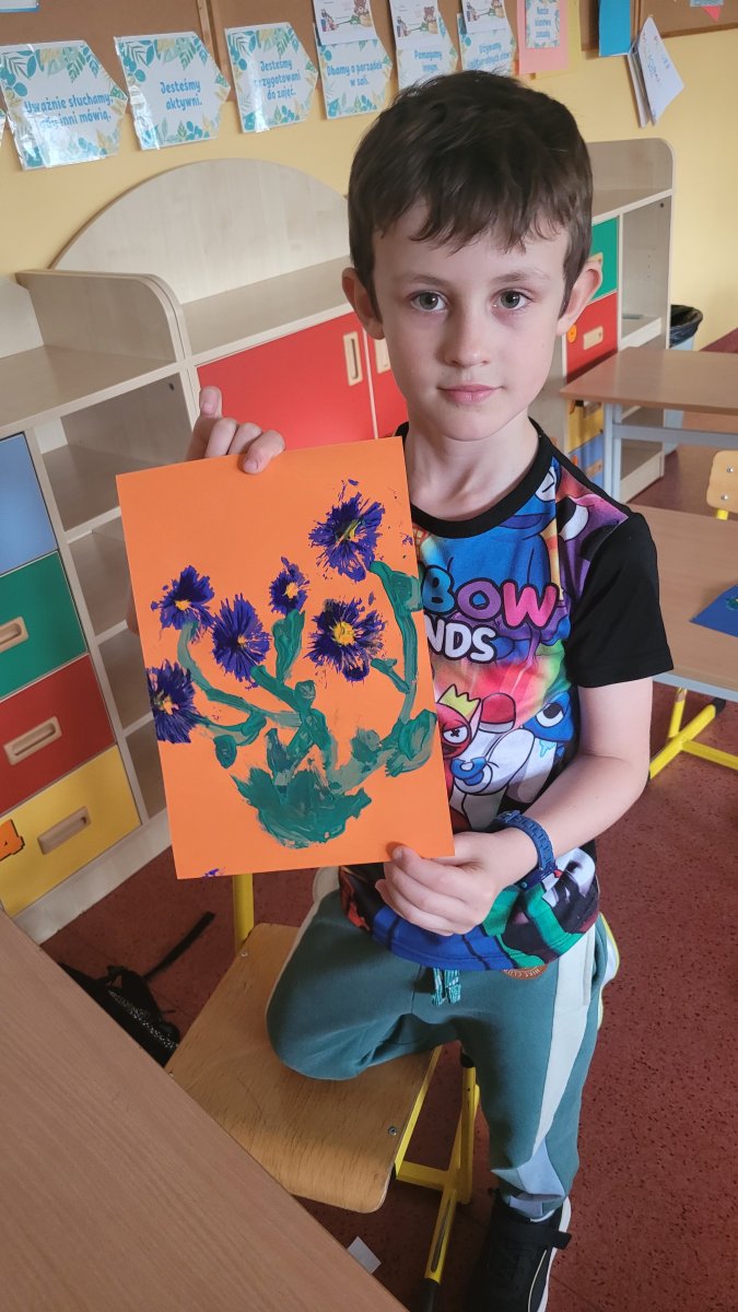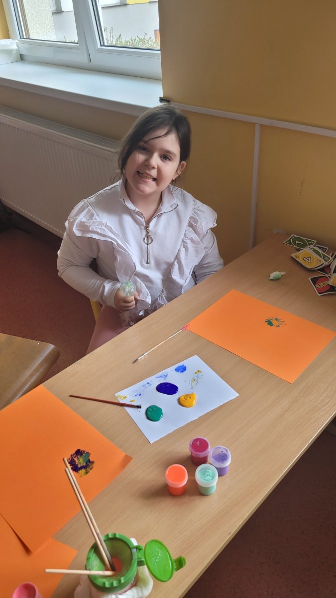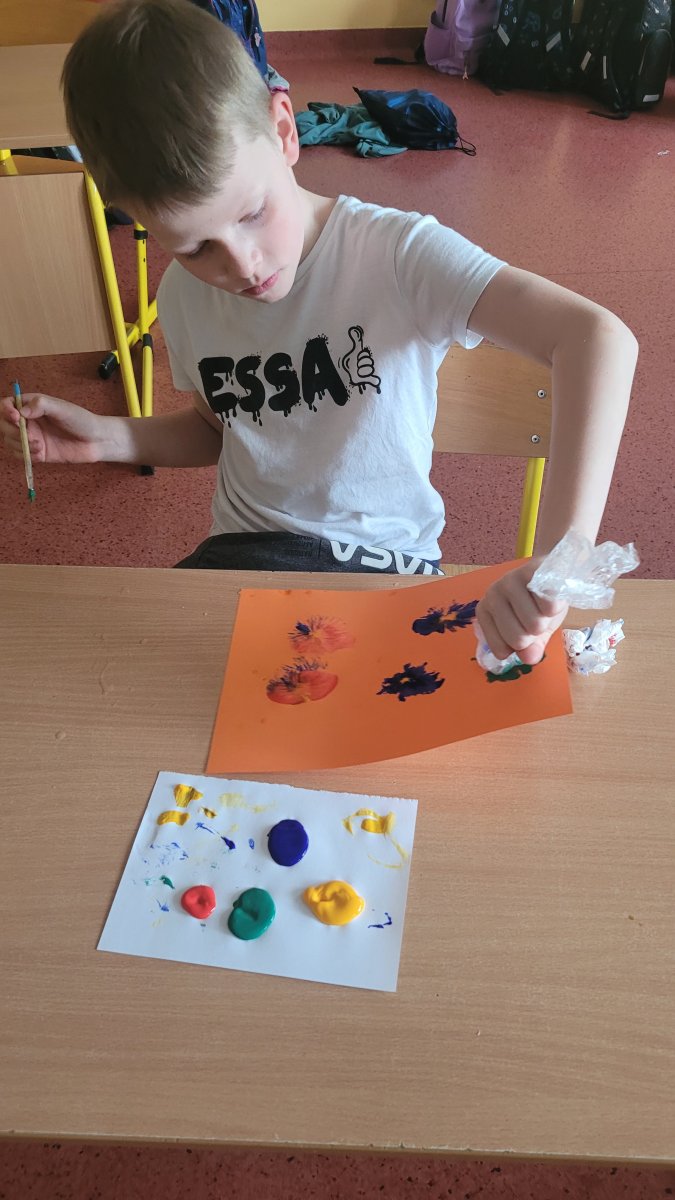 Dzieci z entuzjazmem eksperymentowały z techniką stemplowania przez folię, mieszając kolory i tworząc efektowne kompozycje. Powstały barwne wiosenne kwiaty, które ozdabiają naszą świetlicę