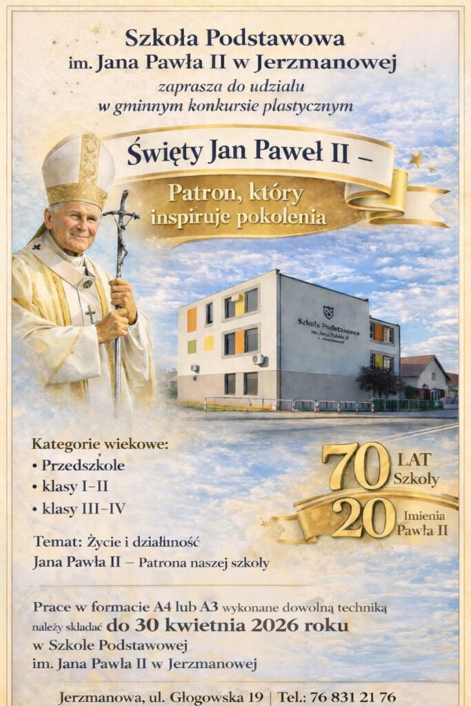Rok 2026 jest dla naszej społeczności wyjątkowy. Szkoła Podstawowa im. Jana Pawła II w Jerzmanowej świętuje bowiem dwa ważne jubileusze: 70 lat swojej działalności oraz 20-lecie nadania szkole imienia wielkiego Polaka – Świętego Jana Pawła II.