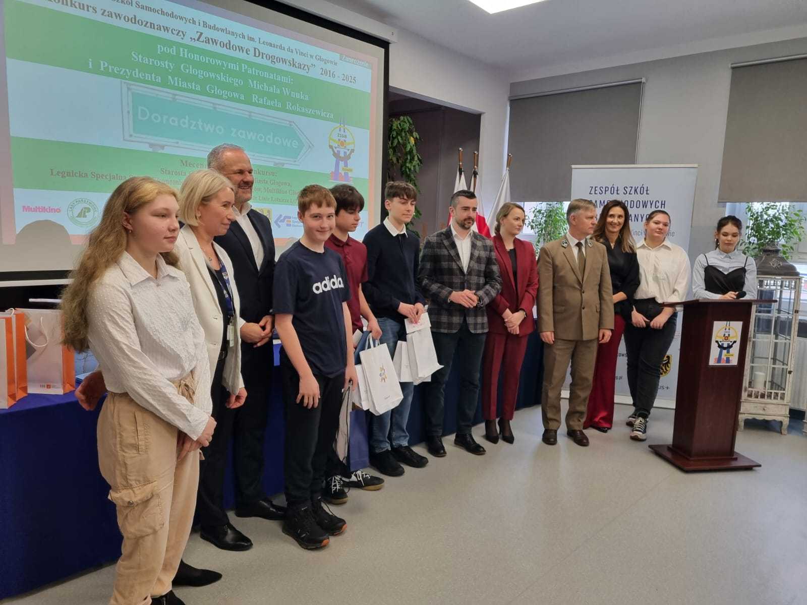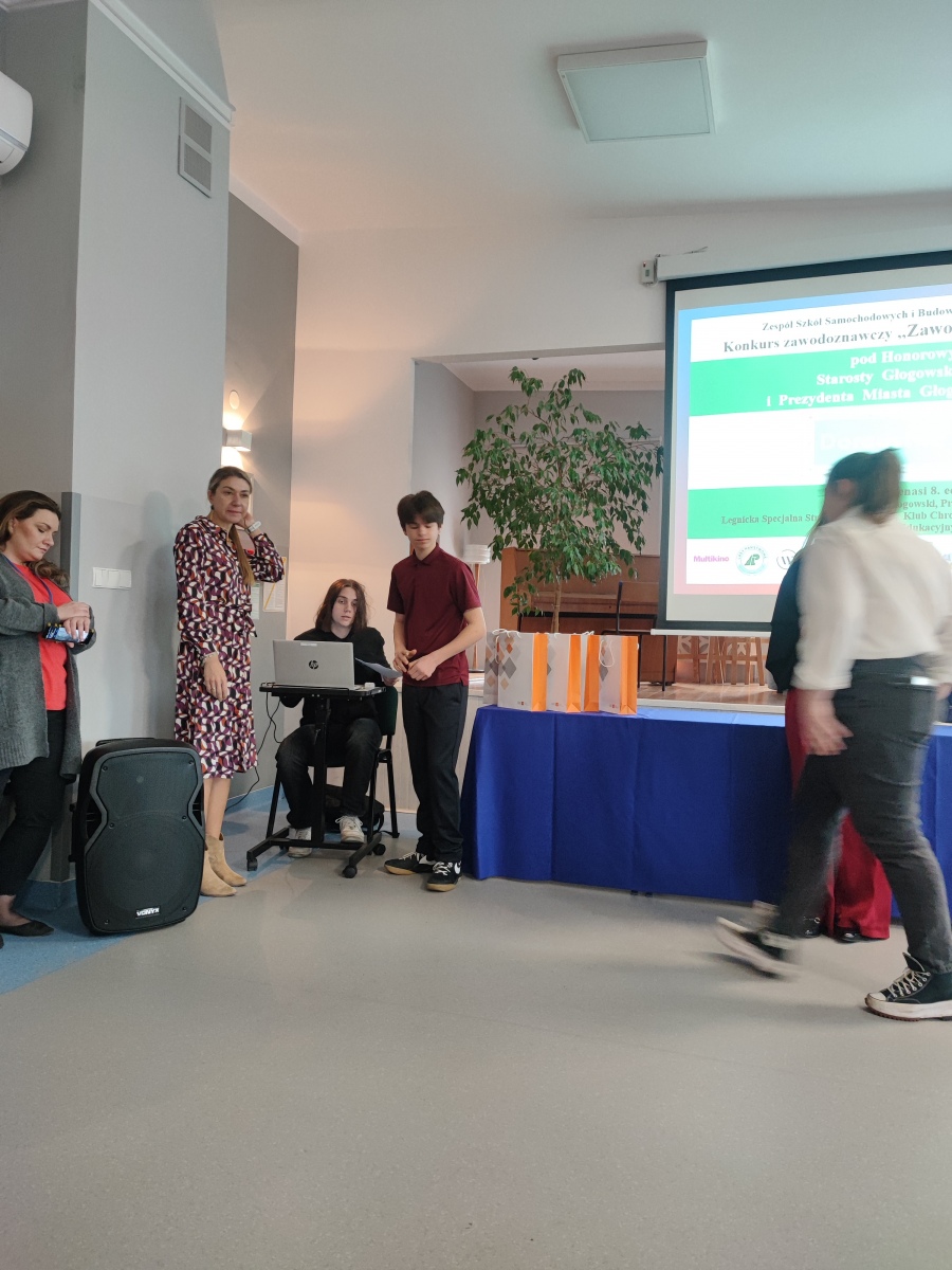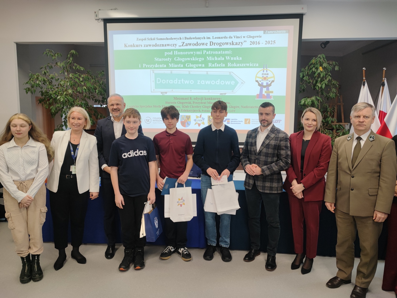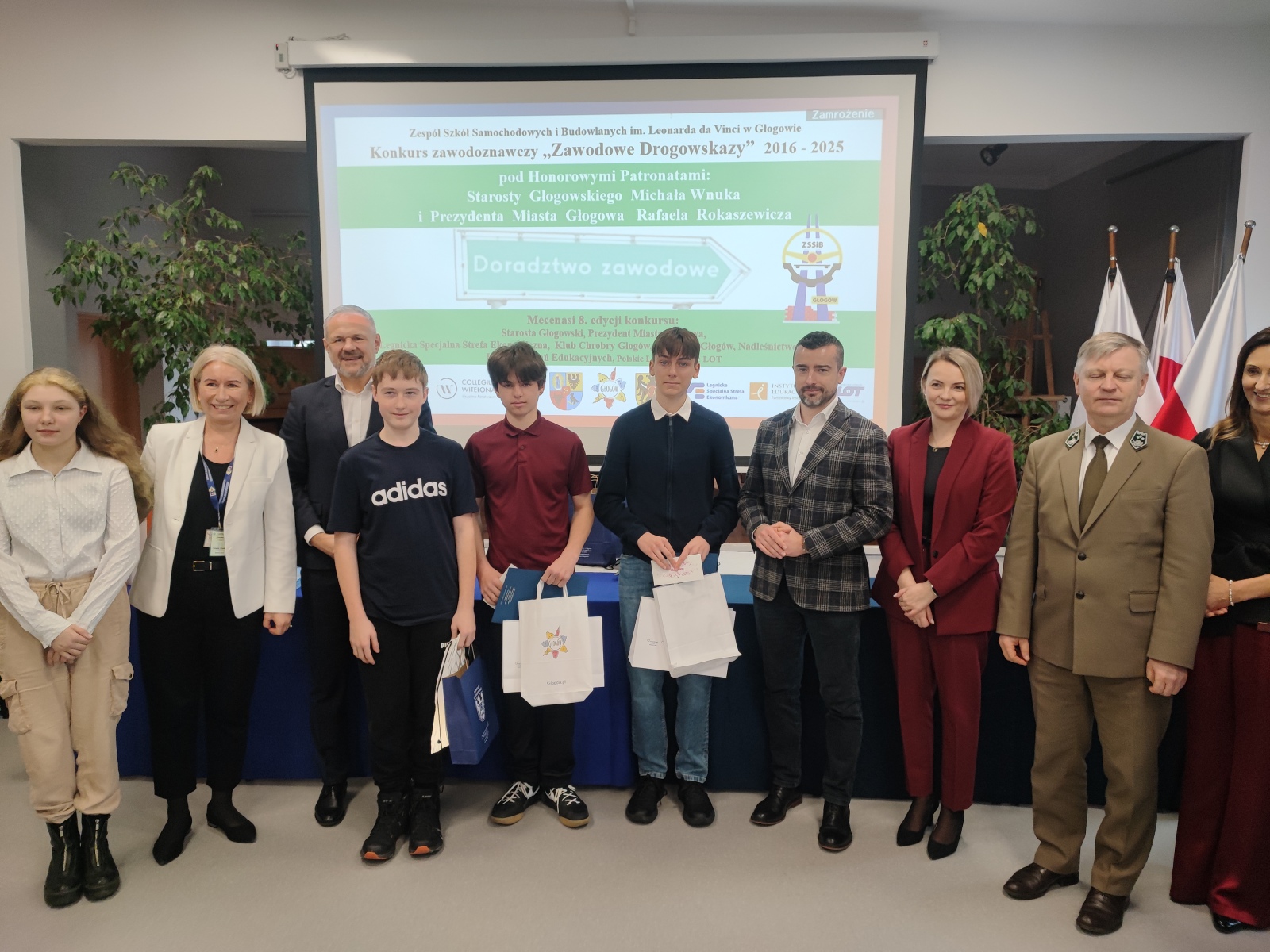 Kolejna edycja konkursu z doradztwa zawodowego organizowanego przez ZSSiB w Głogowie za nami. Uroczysta gala wręczenia nagród odbyła się 26 lutego w siedzibie szkoły. Honorowy patronat nad konkursem sprawują: Starosta Głogowski oraz Prezydent Miasta Głogowa. A niezmordowaną i jak zwykle niezwykle profesjonalną organizatorką jest doradczyni zawodowa, Joanna Gajdzińska. Z dumą informujemy, że uczeń klasy 7c, Wojciech Wolniak zajął I miejsce w tym prestiżowym konkursie. Z naszej szkoły swoją pracę zgłosił również Dominik Piątek z klasy 8b, który w zeszłym roku zajął II miejsce. W związku z tym, obie klasy miały przyjemność uczestniczyć zarówno w gali jak i warsztatach kompetencji miękkich prowadzonych przez Rektora PANS w Głogowie, dr Jarosława Hermaszewskiego. Opiekunem prac z ramienia Szkoły Podstawowej im. Jana Pawła II w Jerzmanowej była doradczyni zawodowa, pani Barbara Tuczyńska. Dziękujemy organizatorom za możliwość uczestnictwa w tak niezwykłym wydarzeniu. Wszystkim biorącym udział gratulujemy zaangażowania i życzymy dalszych sukcesów edukacyjno-zawodowych.
